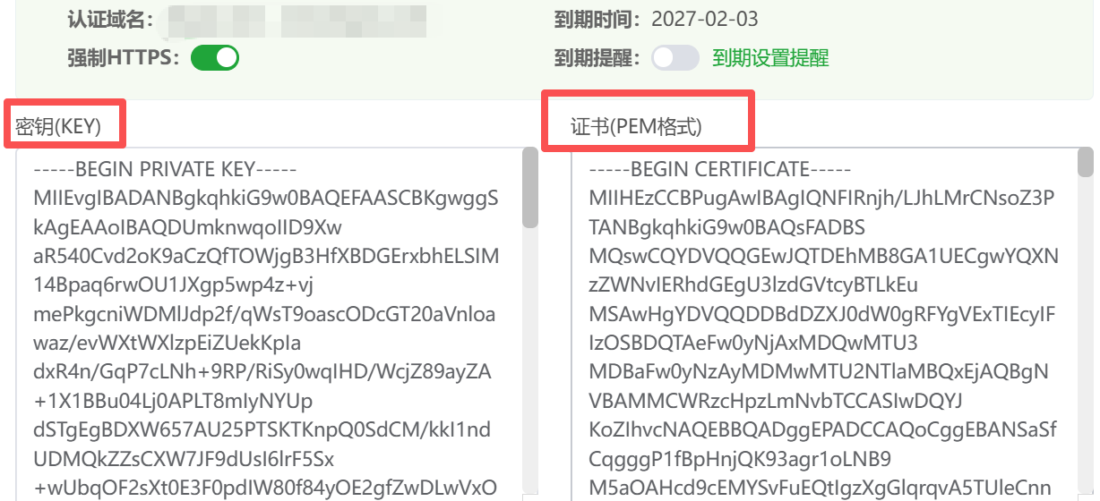 我们以宝塔面板为例,在复制时切记注意KEY格式和PEM格式对应的文件是否复制错了,需要一一对应。