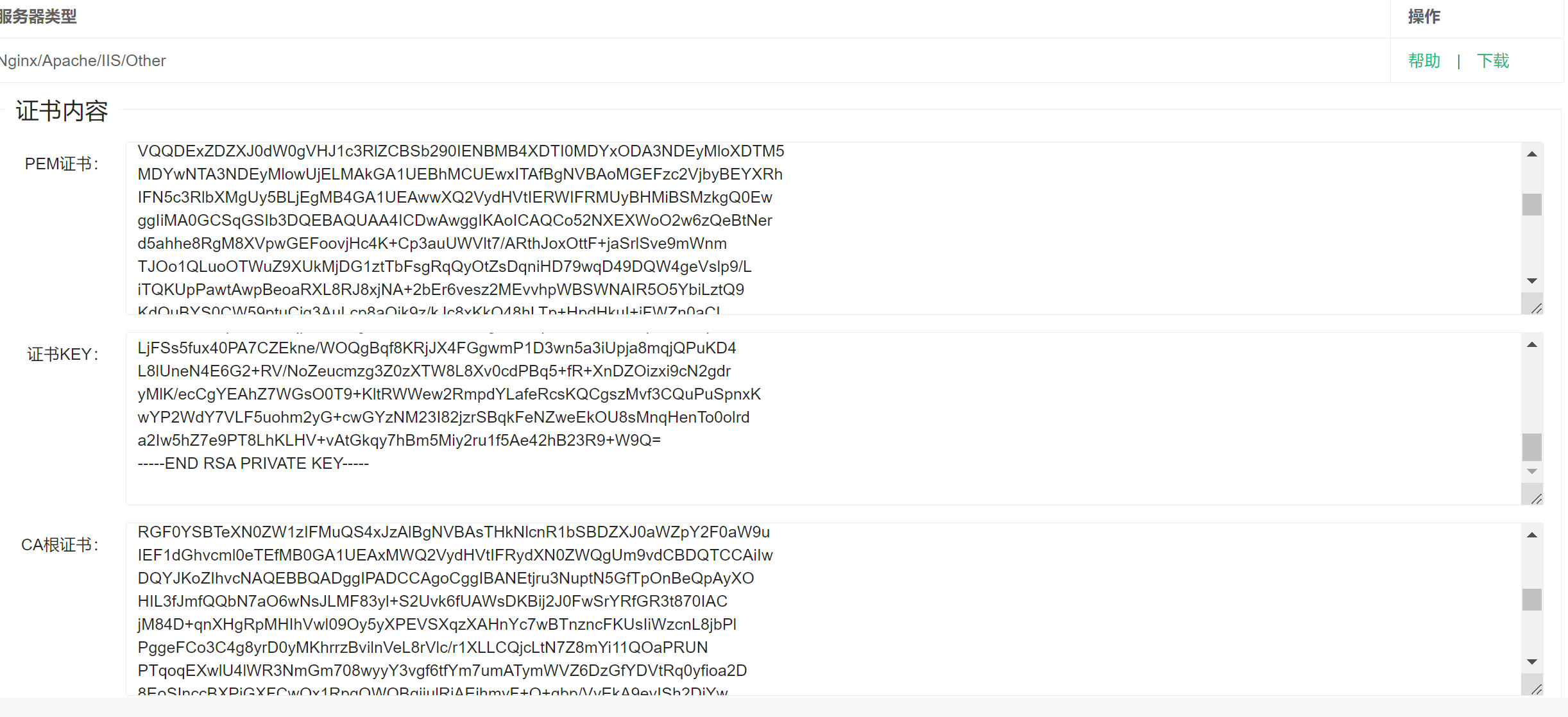 VSSL提供完整的证书链格式以便于您复制,包含PEM、KEY、以及CA根证书,可以根据需要复制内容。